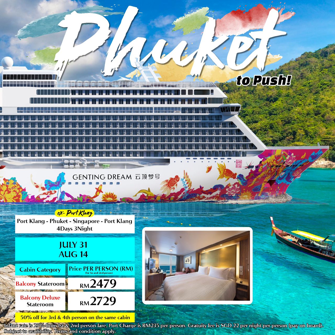 Port charges (Port Klang) : 2D1N (RM78) / 3D2N (RM165) / 4D3N (RM235) / 4D3N (RM235) / 5D4N (RM280) -